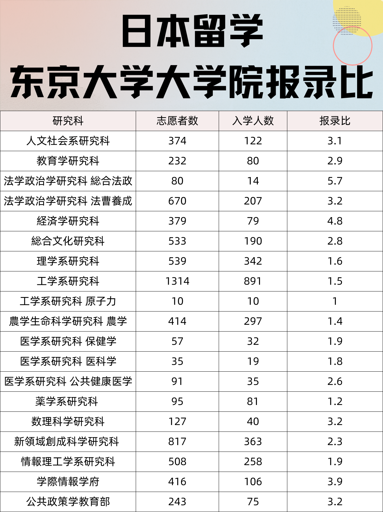 東大對(duì)于報(bào)考人數(shù)、入學(xué)人數(shù)的具體統(tǒng)計(jì)標(biāo)準(zhǔn)可能和國內(nèi)有所不同,并且其中只標(biāo)明了社會(huì)人入試的人數(shù),沒有強(qiáng)調(diào)留學(xué)生和一般入試的差別。因此,沒法分開日本國內(nèi)學(xué)生和留學(xué)生來算報(bào)錄比,只能根據(jù)官網(wǎng)的數(shù)據(jù)直接計(jì)算出如圖的結(jié)果,為大家提供一個(gè)新的角度而已,僅供參考哦~