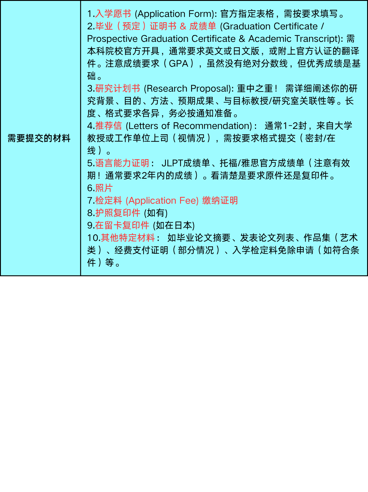 大方向都是相似的,但是日本高校體系最不同的就是高校的自主決定權很高,不同學校不同研究科不同教授的要求可能都不一樣,需要精準獲取信息: