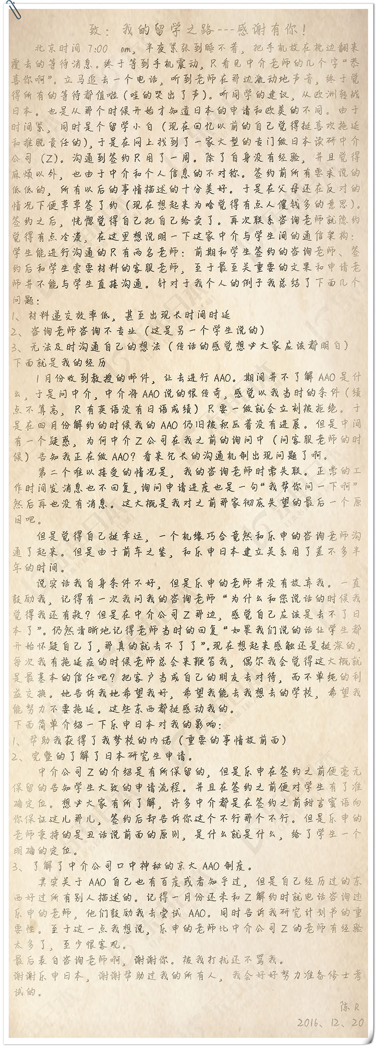 我是之前在某中介申請不順利,退辦后。在樂申日本進行申請。申請過程中經歷了很多坎坷比如教授的拒信等等,拒信對我來說等于最大的坎坷。但是最終如愿去了京都大學。下面講述的是一件發生在我身上的留學申請故事。